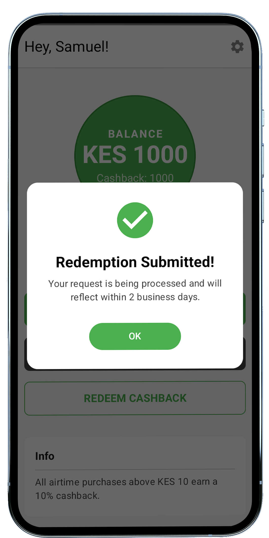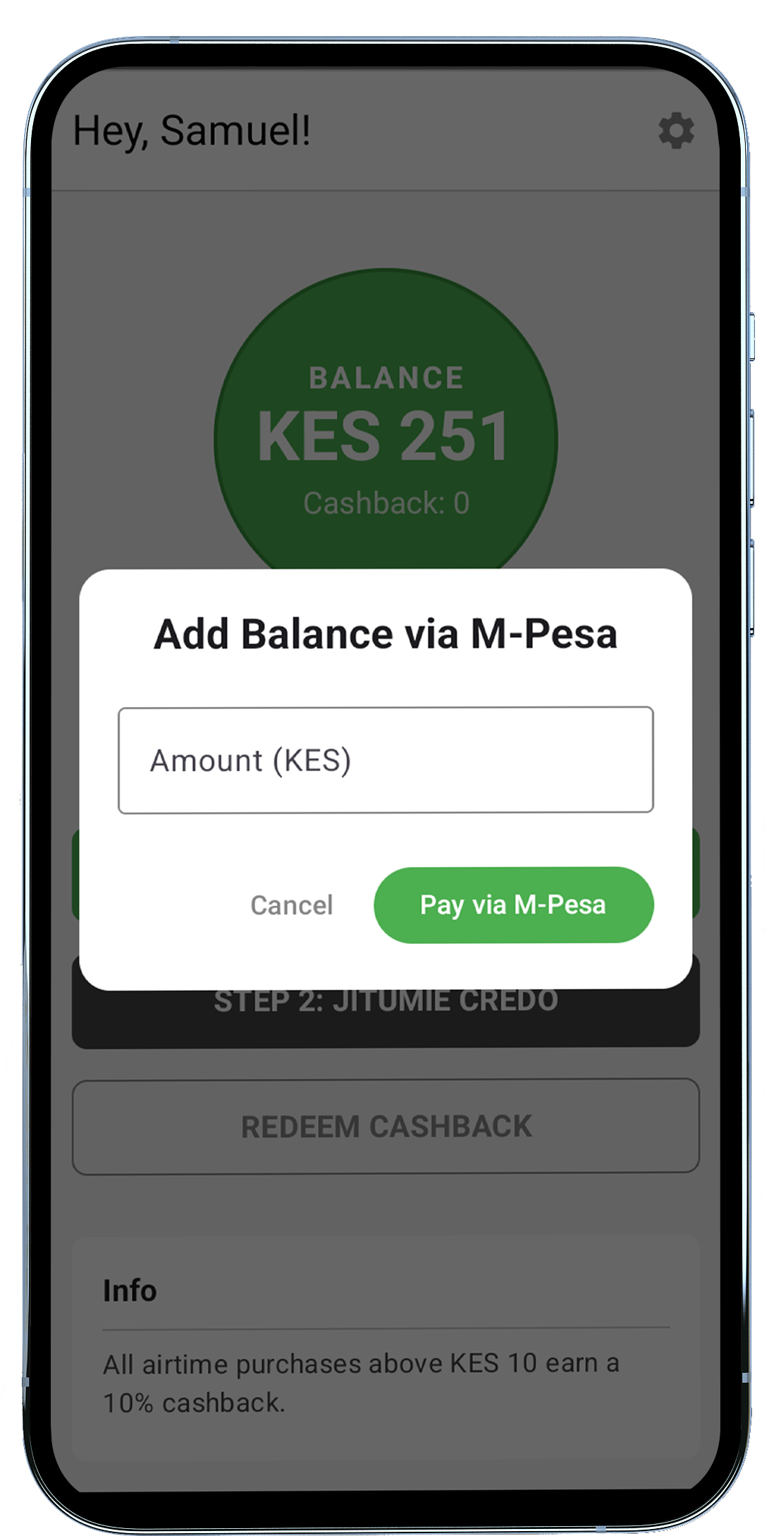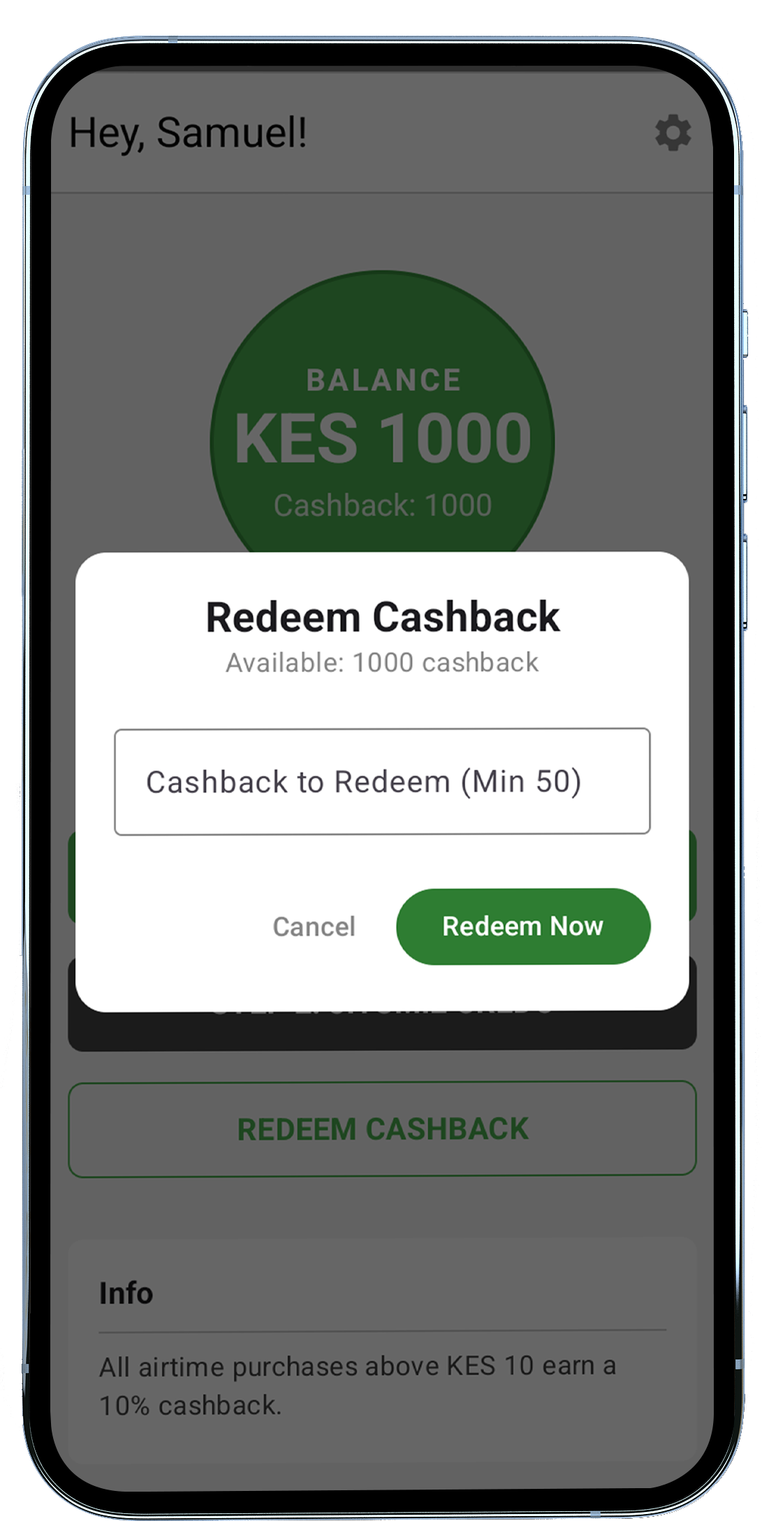 Easily add funds to your wallet using M-Pesa. It’s fast, secure, and sets you up to start earning cashback on every airtime purchase.