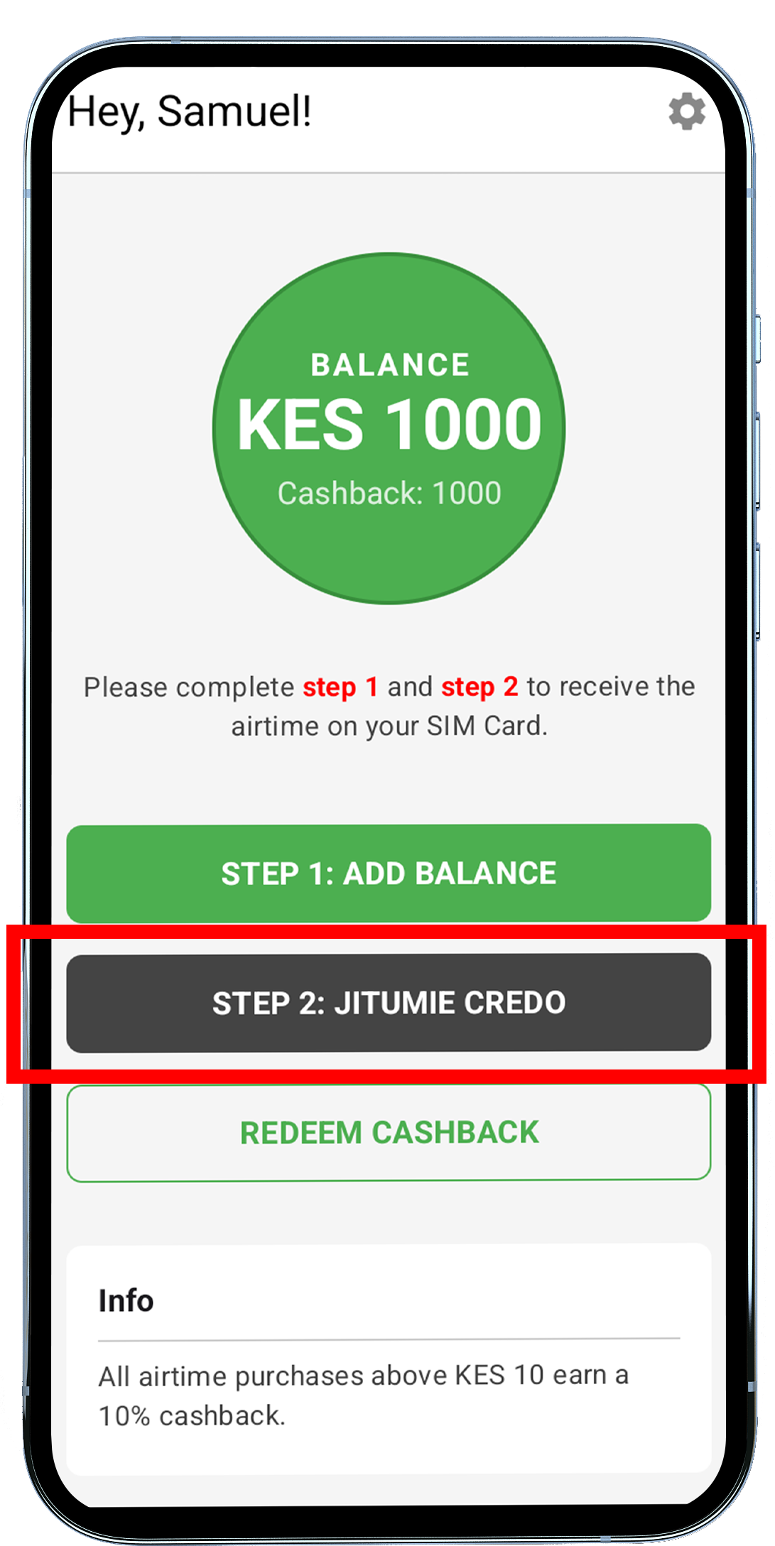 Press the “Jitumie Credo” button to instantly send airtime to your own number or someone else’s.